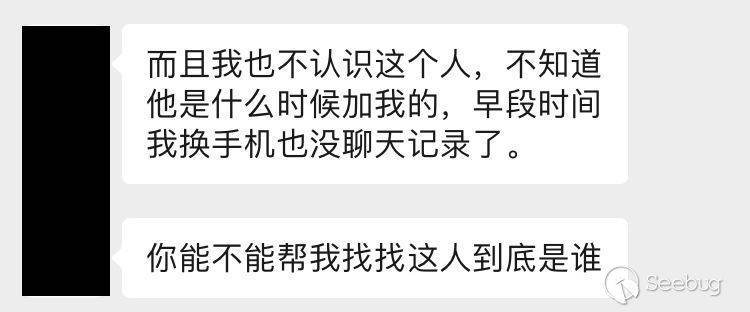 她說自己并不記得這人是什么時候有她微信好友的,早段時間剛換了手機,聊天記錄都沒有了,對這人也沒印象,想拜托我找到這人是誰。