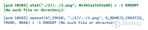 例如在kali 下 Imagick::writeImage寫入 ./1?/../1.png , ./1? 這個目錄是會報錯的。具體系統調用如下