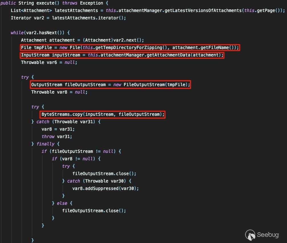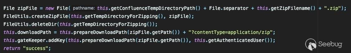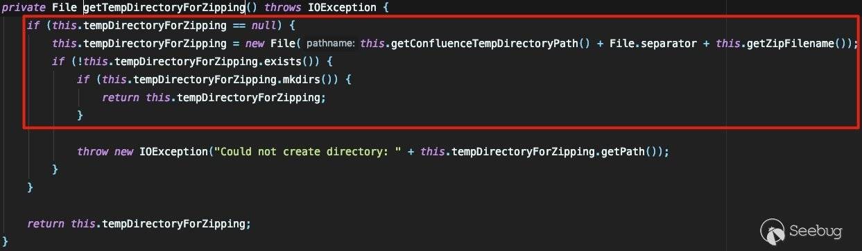是根據時間和隨機數生成的一個目錄,格式類似于download2q1gP165938,這里我們通過方法的名字就能看出這里是建立了一個創建一個zip的目錄,這個目錄在confluence_home/temp/