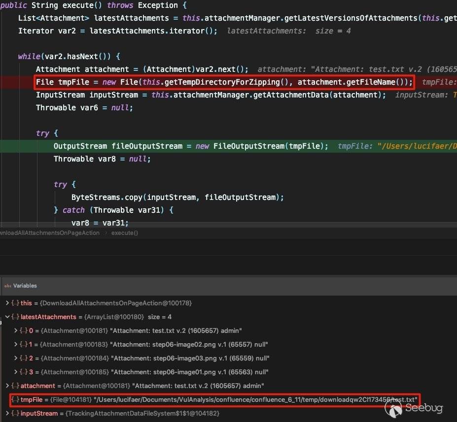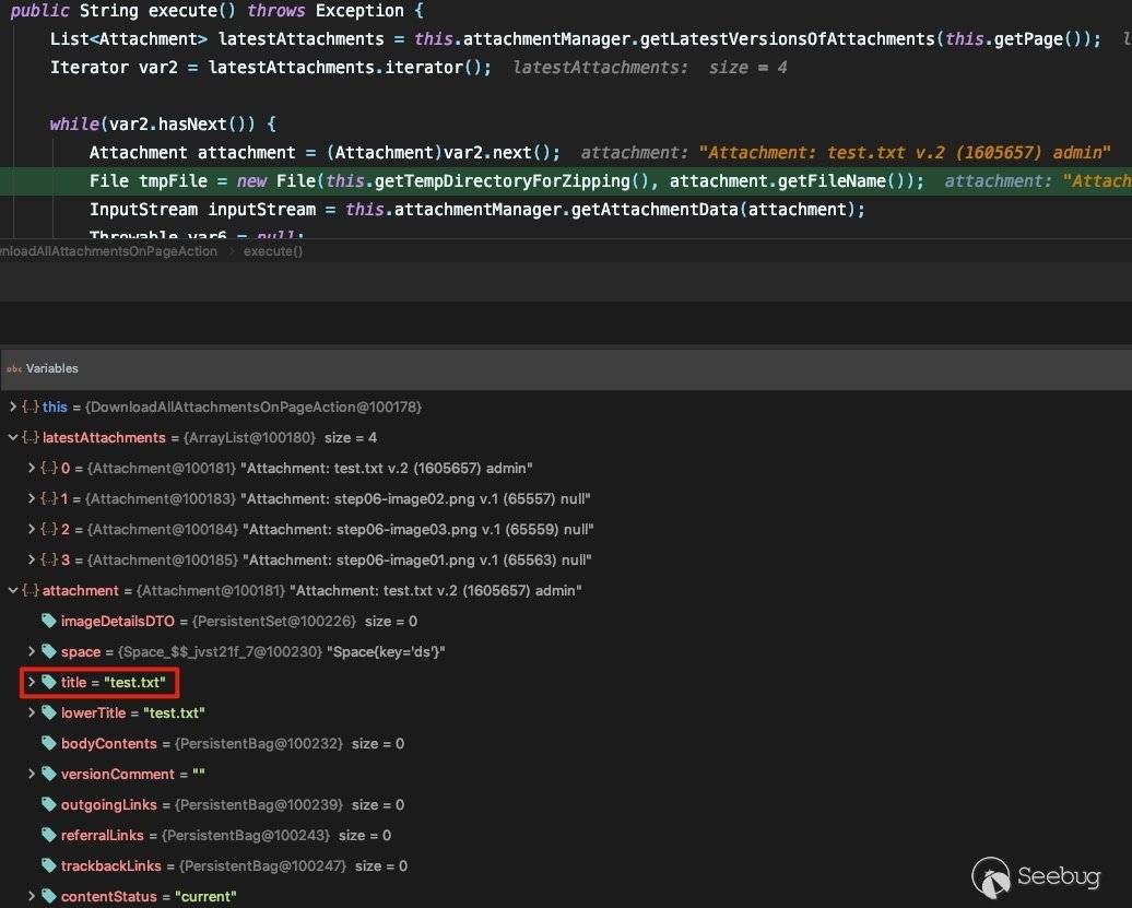DownloadAllAttachments位于com.atlassian.confluence.pages.actions.DownloadAllAttachmentsOnPageAction,為了便于快速的解釋這個漏洞,我用動態調試+靜態分析的方法來進行說明。