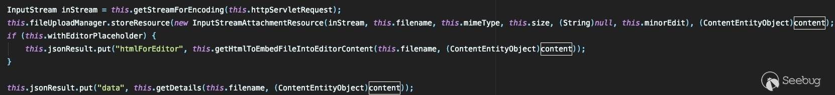 直接上傳這里是調用的com.atlassian.confluence.pages.actions.beans.FileStorer,關鍵點在: