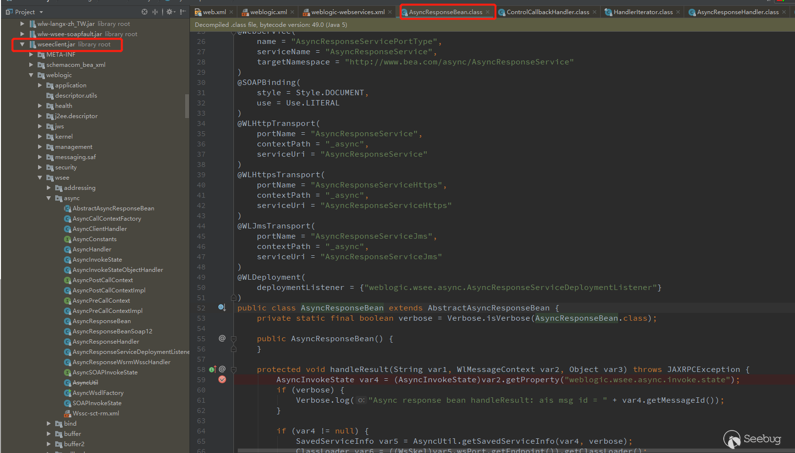 See weblogic.wsee.async.AsyncResponseBean class in weblogic-webservices.xml, view this class and find it in wseeclient.jar