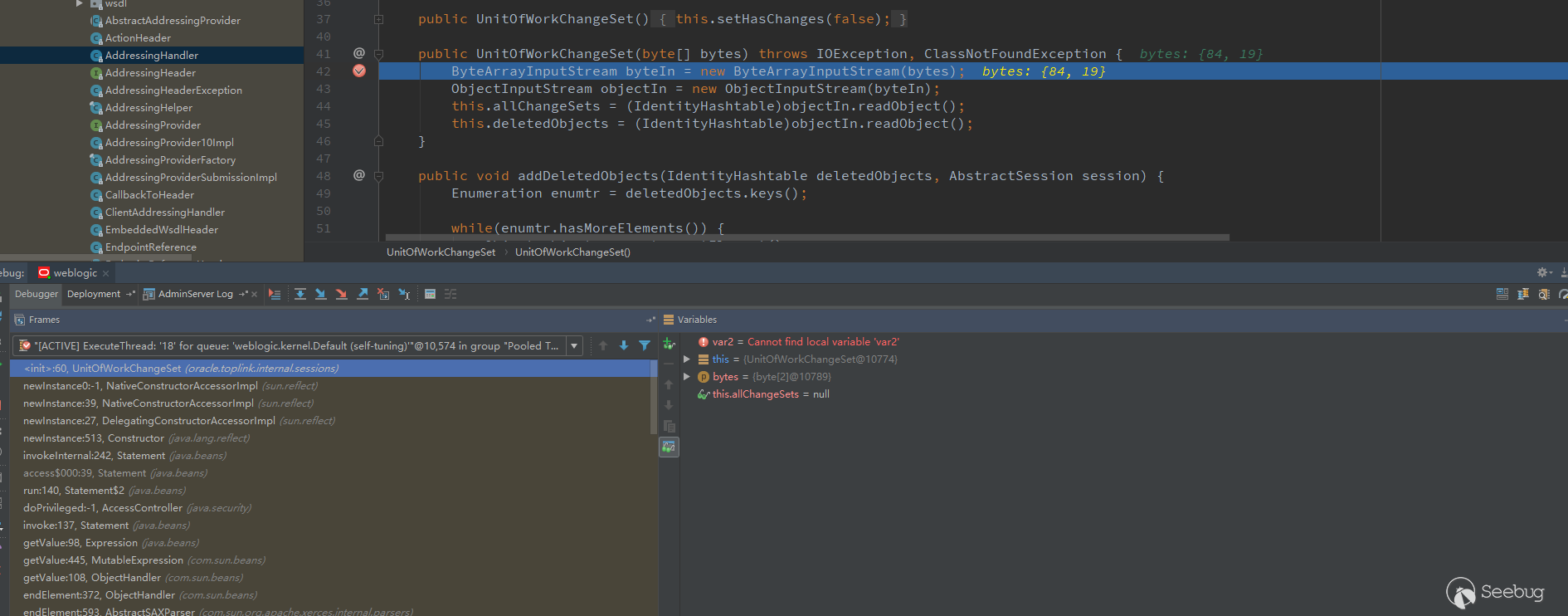 See the string var2 = (String)var1.getProperty("weblogic.wsee.addressing.RelatesTo") in the image; this step never gets the value, causing the process to end. In order to solve this problem, I have turned a lot of information, and finally found a similar example, you can use <ads:RelatesTo>test</ads:RelatesTo> to assign value to weblogic.wsee.addressing.RelatesTo.