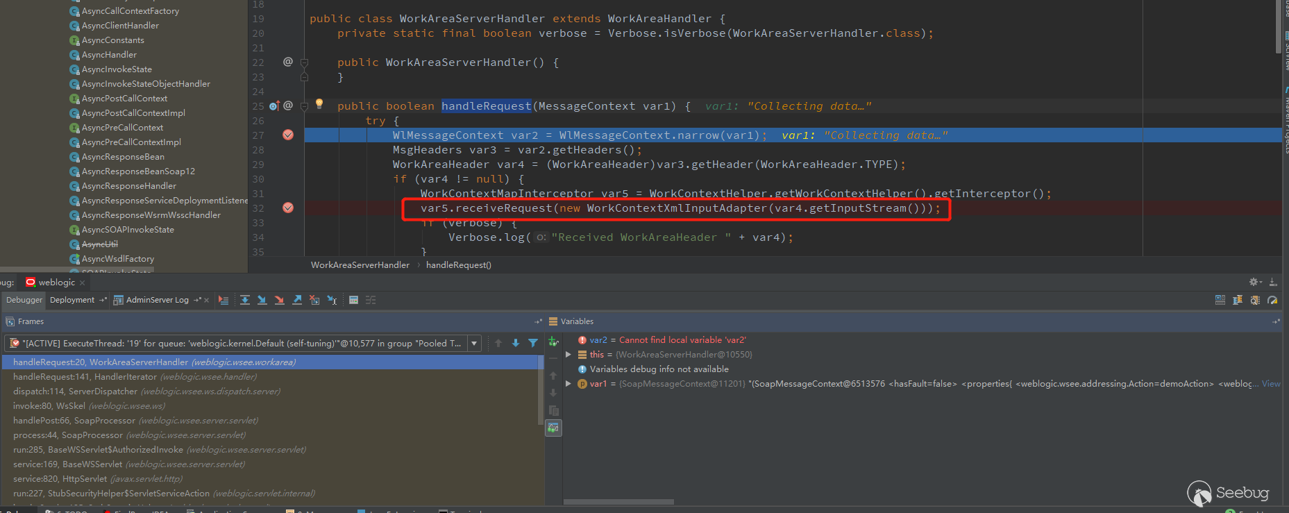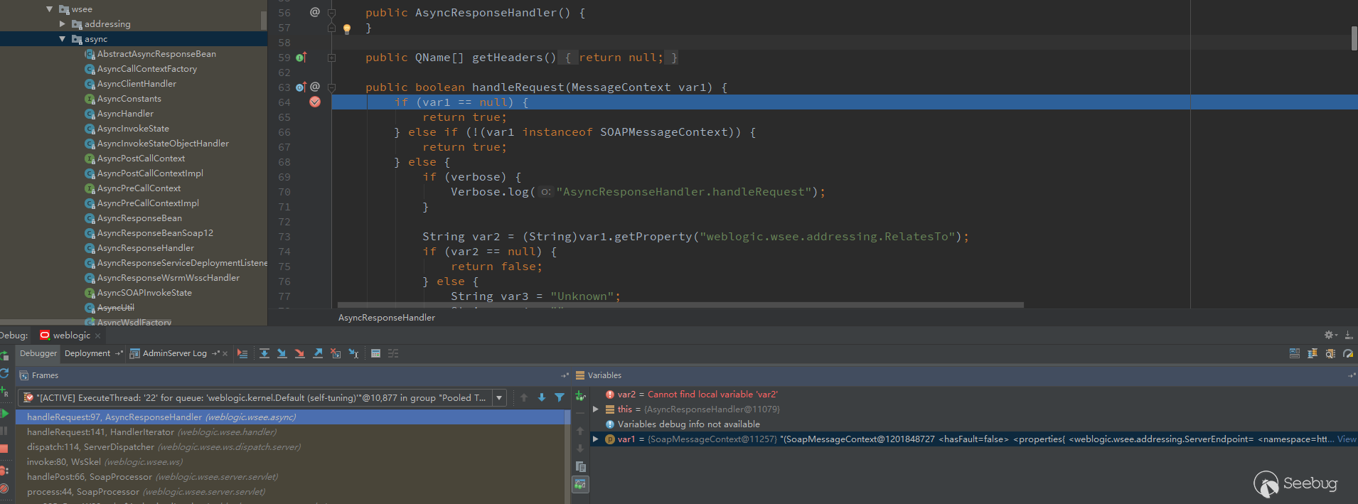 There is no debug to the breakpoint. Finally, I put all the methods of all classes in wsee/async with breakpoints, resend the message, and successfully intercepted the handleRequest in the AsyncResponseHandler class.