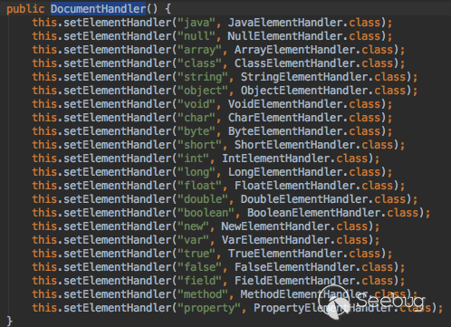 XMLDecoder對每種支持的標簽都實現了一個繼承與ElementHandler的類,具體可以在DocumentHandler的構造函數中看到: