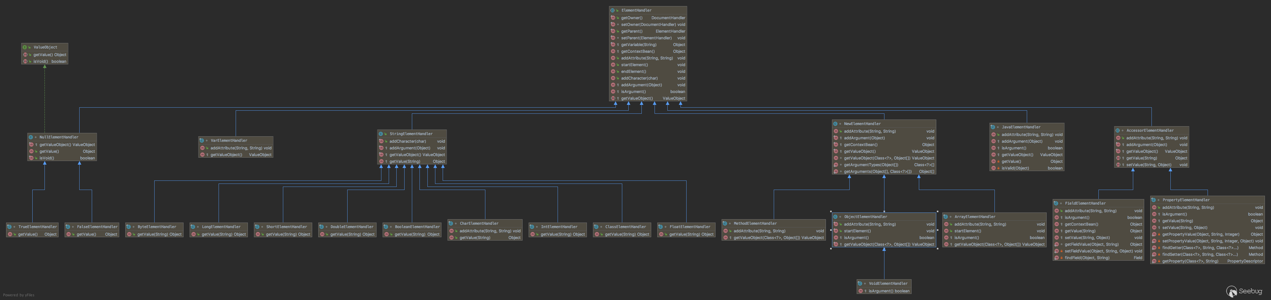 ElementHandler: 獲取當前標簽所產生的對象對應的ValueObject實例。具體實現需要看每個ElementHandler類。