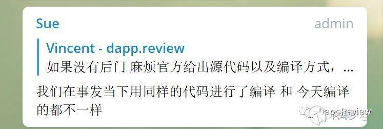 這種可能性是基于“可能一”中的官方回復的一種暗示,即項目方在合約部署時確實使用的是沒有后門的合約,編譯工具在部署合約到主網的過程中出現了貓膩,加入了有問題的后門。但項目方目前沒有提供任何的可驗證信息,使用的編譯工具,以及同樣代碼兩次編譯不同結果的信息。