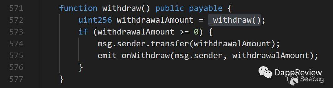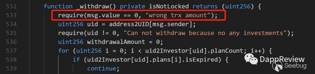在TSC上認證過的開源代碼中,如果發送金額不為零調用withdraw函數,交易會被撤回。