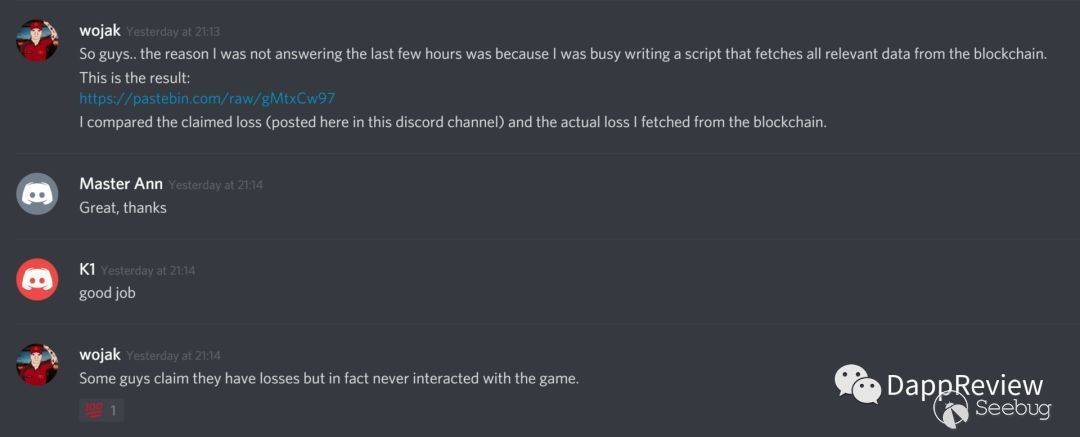 在探討這種可能性時,如何欺騙TSC成為了焦點,如果真的TSC的驗證存在Bug,那么這意味著之前所有通過TSC認證并標榜開源的Dapp都不再可信和透明,事實上,在Discord群里,TSC的開發者Khanh承認代碼已經很久沒有維護并存在bug的可能性,也有其他開發者證實自己實際部署的代碼和通過認證的代碼可以不完全相同。