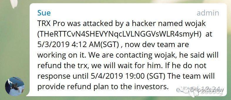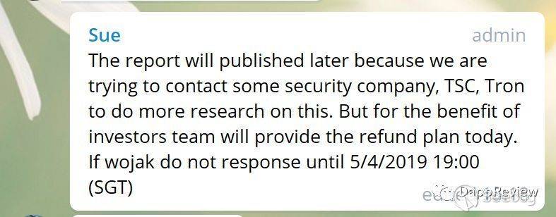 整整一天之后,Tronbank項目方再次發出通知,他們正在聯系wojak進行退款,如果wojak在5月4日晚7點時沒有任何回復,官方將提供給投資人的補償方案。