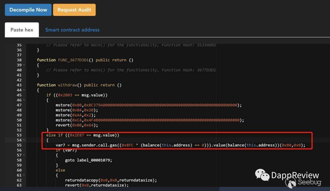 在主網上部署的合約,通過反編譯發現,調用withdraw函數時,如果發送金額等于0.011911 TRX,則會轉移全部合約余額;
