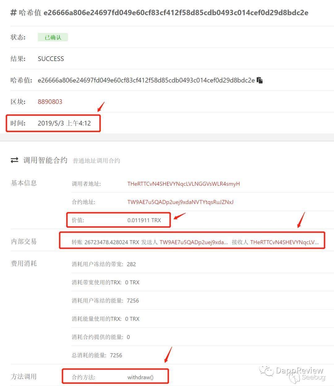 注意到,該筆交易調用的是合約里withdraw函數,發送的金額為0.011911 TRX,要注意在Tronbank正常的業務邏輯下,調用withdraw函數是不應該發送任何TRX的,金額應該為0. 這一點在源代碼中就可以驗證。