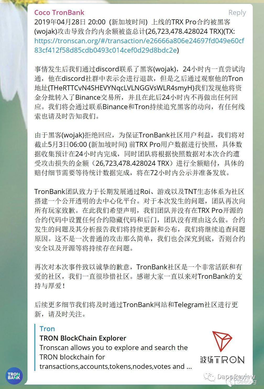 5月4日晚上7點 Tronbank項目方如約公布了賠償方案,令大部分人吃驚的是項目方沒有跑路,而是承諾在24小時內收集信息,并在72小時內進行全額賠付。如果賠付照常發放,這可能是Dapp歷史上最大的一次項目方賠付。