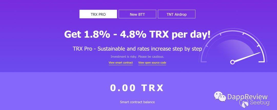 像Tronbank這樣資金盤屬性的Dapp,往往都會把代碼開源讓合約和邏輯變得透明可信來吸引投資人,在網站最明顯的位置,也標明了通過第三方驗證工具tronsmartcontract.space(以下簡稱TSC)進行合約代碼驗證后的代碼信息。