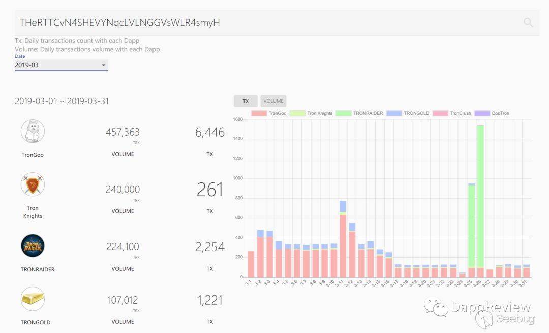 合約余額歸零后,項目方telegram群里面騙局和黑客的質疑聲不絕于耳,DappReview和小伙伴們開始著手研究到底發生了什么。"黑客"的地址為THeRTTCvN4SHEVYNqcLVLNGGVsWLR4smyH,利用DappReview的玩家數據查看工具,可以看到該地址的所有者像是一個正常的Dapp玩家,從今年1月到5月該玩家涉獵過數十個Dapp,其中TronGoo是他玩過最多的游戲,從TronGoo官方排行榜可以看到他就是排名第二的大戶玩家。