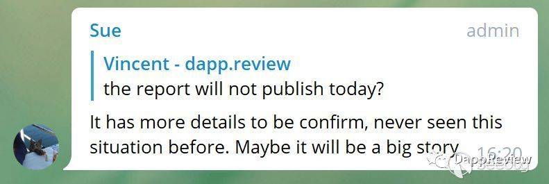 針對之前所承諾的24小時內給出事件分析報告,官方將再次延期,聲稱將聯系安全公司,TSC以及波場官方做更多的調查。同時評論到,有很多細節仍需確認,之前從未遇到類似情況,這有可能是一個精彩的故事。