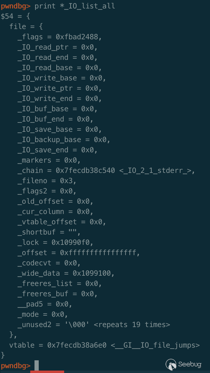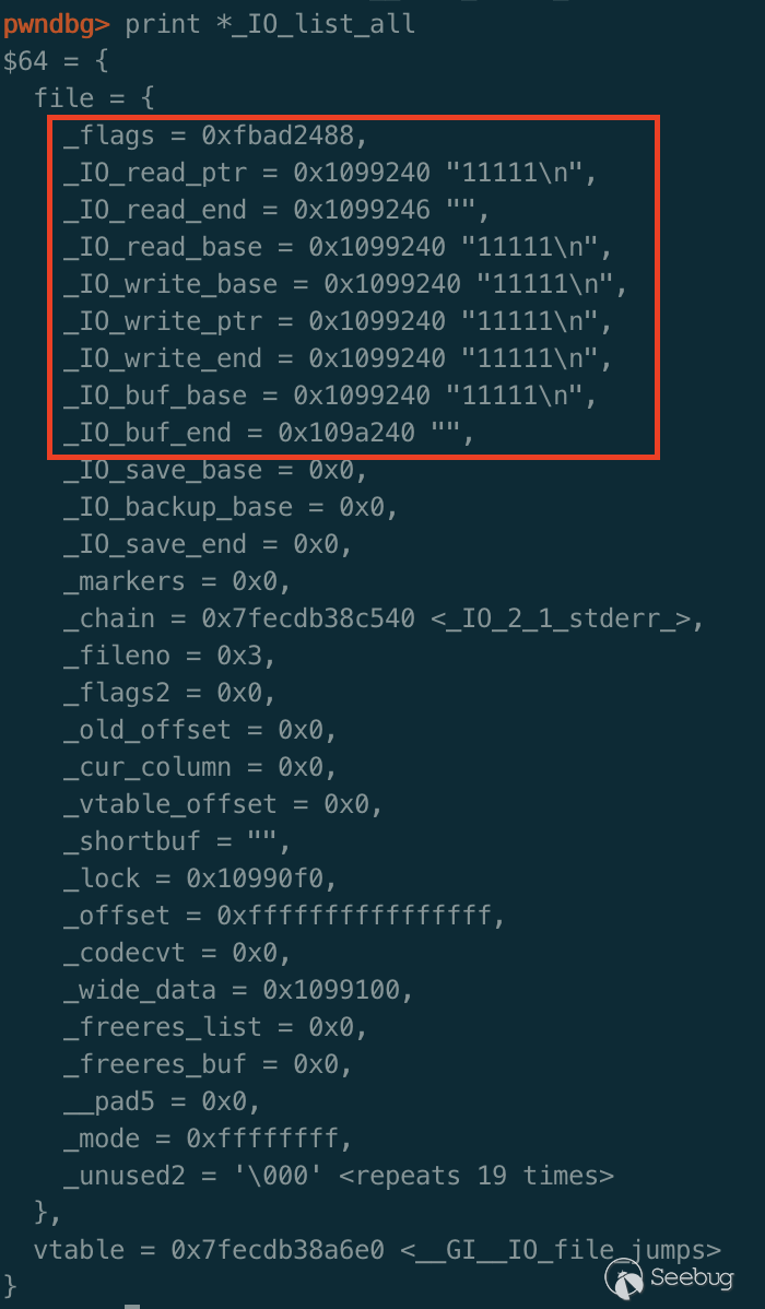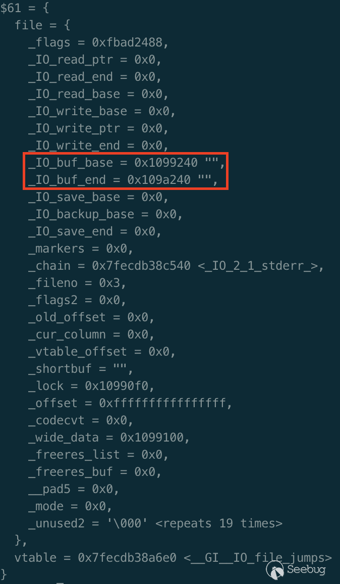 函數相對比較簡單的就是設置了_IO_buf_base和_IO_buf_end,可以預料到_IO_setb函數執行完后,fp的這兩個指針被賦上值了: