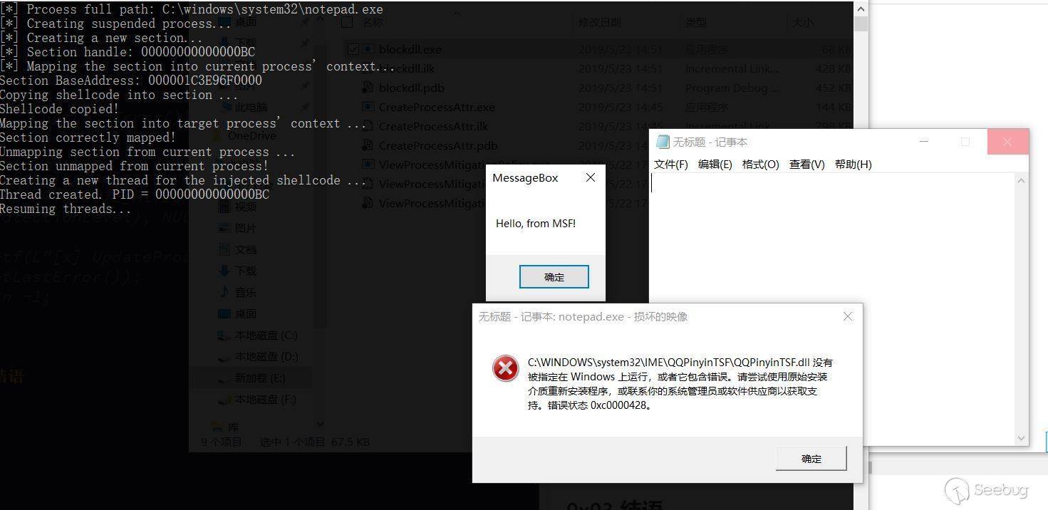 可以看的出成功以后,msgbox執行,notepad也執行起來,由于我裝個QQ輸入法,當我點擊notepad的時候輸入法的dll會加載失敗