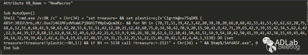 在AutoOpen函數中包含了一串混淆過的 cmd 命令,經過解密后的代碼如圖所示: