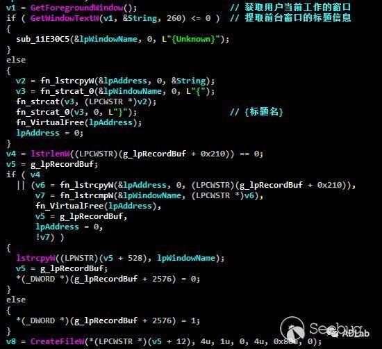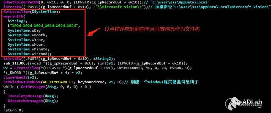 當接受到的控制命令為為啟用脫機鍵盤記錄時,此木馬則使用鉤子來實現鍵盤記錄功能。該鉤子將捕獲按鍵和窗口名信息保存在C:\user\sss\AppData\Local\Microsoft Vision\目錄下,文件則以當前日期和時間來命名。相關代碼的實現如下圖: