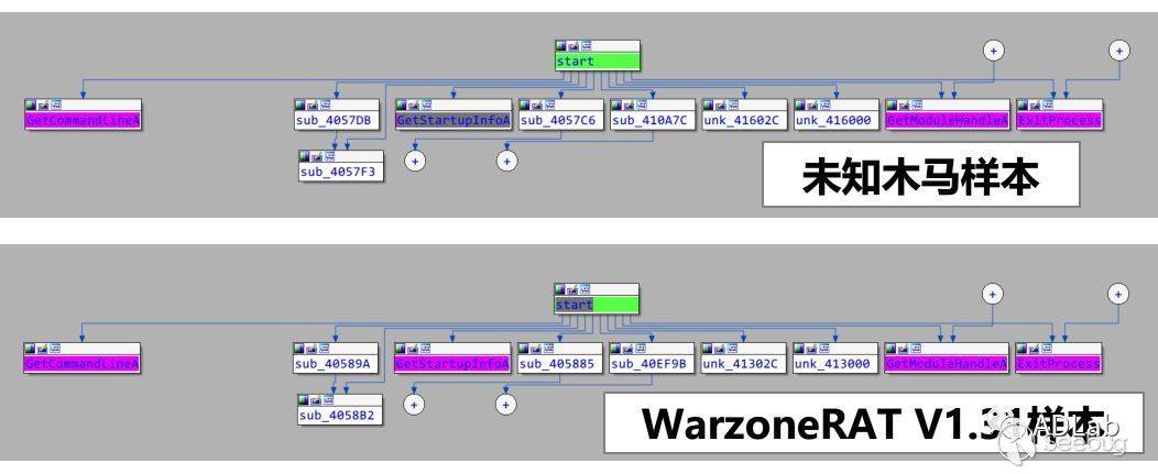 首先,我們在兩種樣本中均發現了特征字符串“AVE_MARIA”,并且針對兩類樣本的代碼結構進行了比對,發現相似度極高。
