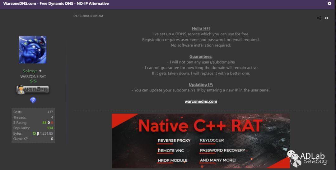 我們收集并分析了大量“AVE_MARIA”類惡意樣本,發現大部分樣本均通過warzonedns.com子域名進行惡意連接和下載,追溯發現其實質為黑客提供的 DDNS 服務。結合攻擊人員的活動線索,我們成功追蹤到 Hackforums 論壇上的可疑用戶Solmyr。