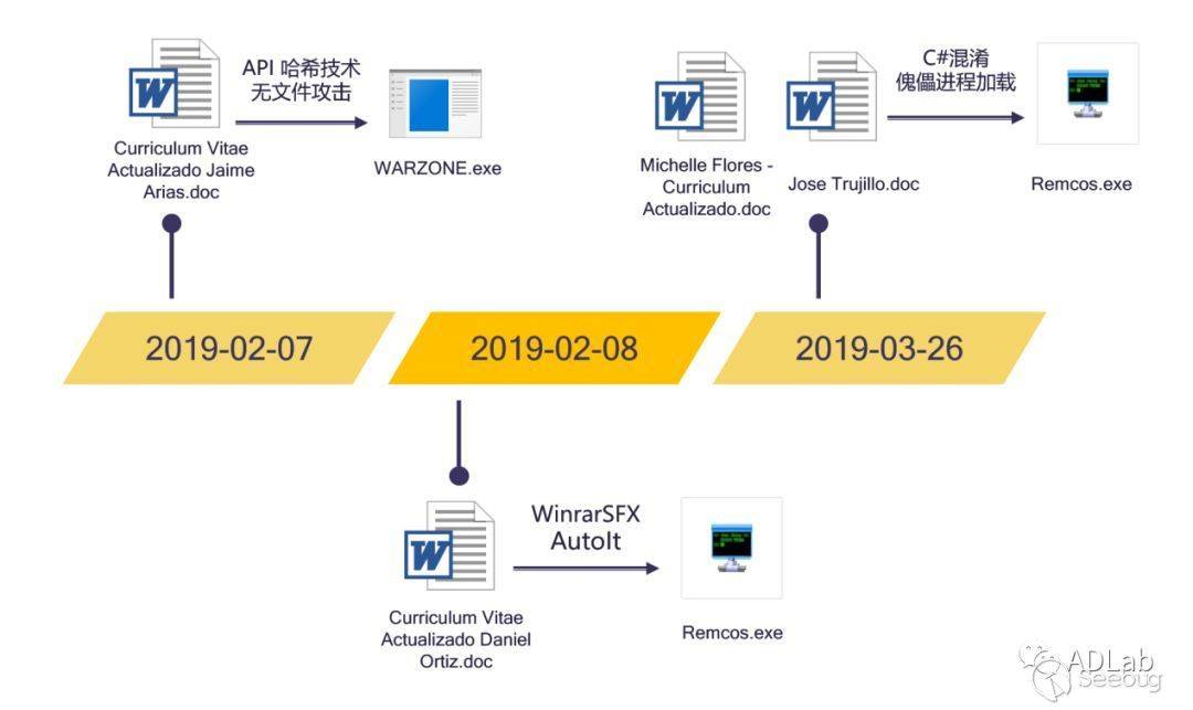 攻擊者使用了API哈希、無文件攻擊、WinrarSFX、AutoIt、C#混淆和傀儡進程等技術來規避檢測并干擾分析人員。其中,“Curriculum Vitae Actualizado Jaime Arias.doc”文檔植入的木馬來源最初無法確認,我們在其中發現了特征字符串“AVE_MARIA”,其與 Cybaze-Yoroi ZLab 研究人員在2018年12月底披露的針對意大利某能源企業進行攻擊的惡意軟件相似度很高,部分安全研究員和廠商因為沒有成功的進行溯源便以此字符串做為該木馬家族的名稱。而我們經過關聯溯源和同源性分析后發現,“AVE_MARIA”類惡意樣本同RAT工具“WARZONE” RAT具有高度一致性,因此將此類惡意家族命名更新為“WARZONE”。