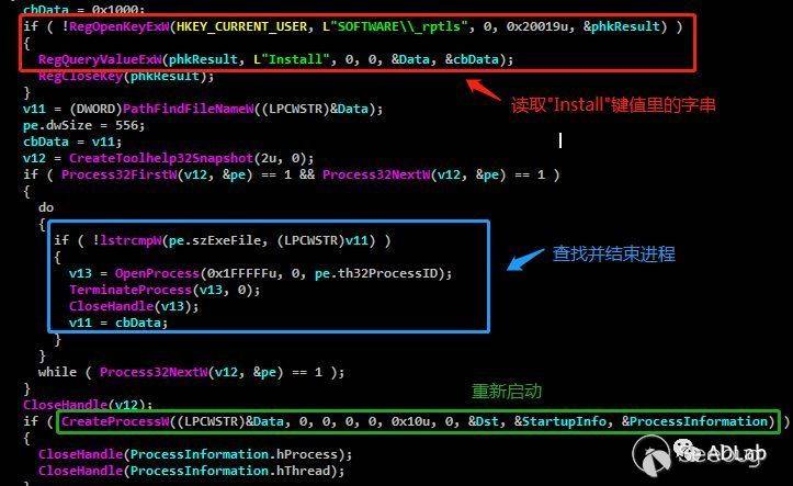 此惡意DLL 的主要功能是獲取注冊表中的“Install”安裝信息(Dropper的路徑)并重新啟動具有管理員權限的 Dropper 新進程。