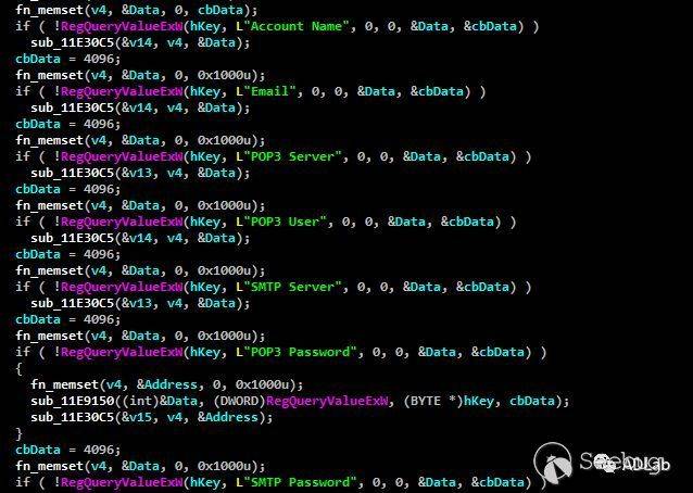 該木馬通過枚舉注冊表·Software\Microsoft\Windows NT\CurrentVersion\Windows Messaging Subsystem\Profiles·下的所有子健,讀取鍵名為下表中的數據比如 password 進行解密還原出明文的密碼。最后將獲取到的用戶的 Outlook 登錄憑證寫入名為“xxx.tmp”的臨時文件中。