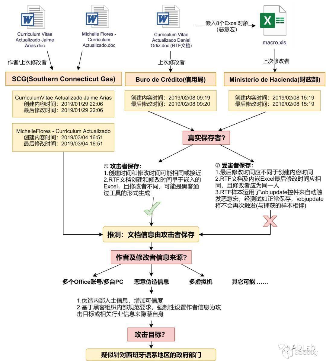 在我們分析這批誘餌文檔時,還發現一個有趣的現象,那就是許多誘餌文檔中包含了文檔作者信息和最后一次保存者信息,并且這些信息均為類似財政部、信訪局、SCG(Southern Connecticut Gas)等等與政府部門相關的信息。通過我們實際測試發現,這些信息均會在文檔修改后變成當前訪問者office登陸賬戶名或者主機名,并且有心的人還可以對其進行任意定制。我們選取幾個典型的樣本并針對相關信息和邏輯關系做了如下梳理和推論: