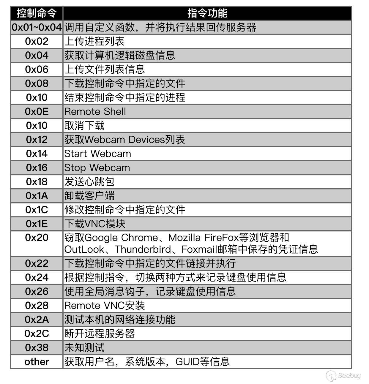 當遠程服務器成功響應數據后,該木馬就會根據服務器返回的內容執行指定操作。部分控制指令功能如下表所示:
