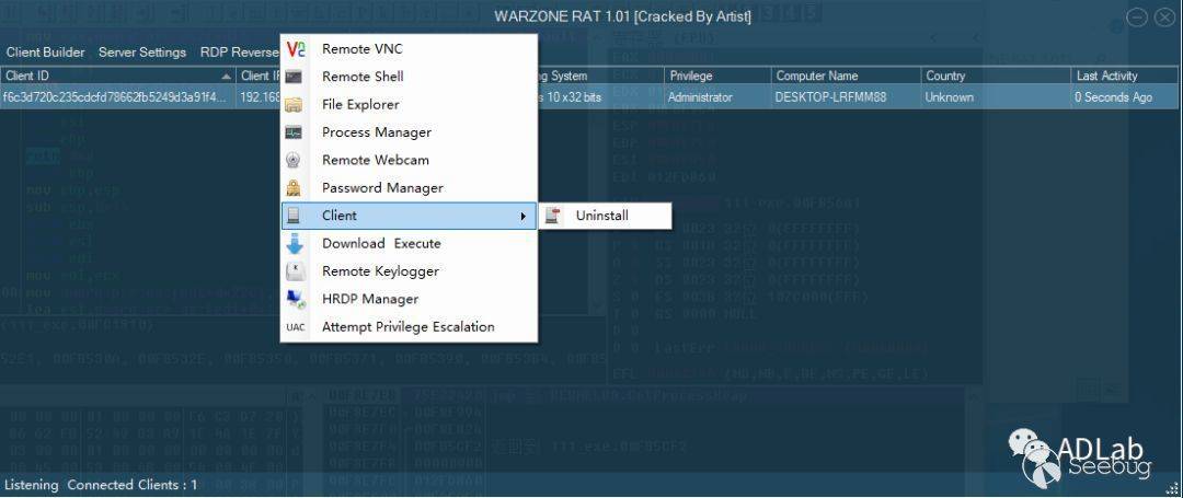 我們將此 PE 文件從內存中 dump 出來,通過分析和溯源后發現,該 PE 與國外某黑客論壇中售賣的 WARZONE RAT 同出一轍。由此我們推測,此處使用的 RAT 模塊可能為WAREZONE RAT1.6 版本,此版本為 C++ 語言編寫,主要功能包括遠程桌面控制、鍵盤記錄、特權升級(UAC繞過)、遠程WebCam、竊取憑證信息、Remote Shell、Offine Keylogger 等等。下面我們會對RAT中的核心部分做簡要介紹。