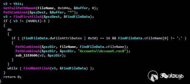 該木馬在 FoxMail 的安裝目錄下查找 Storage 文件夾,接著遍歷所有當前郵箱賬戶目錄下的\Account\Account.rec0文件。此文件實際上就是用來存放賬戶相關信息的,加密后的密碼就默認保存在這里。木馬獲取并解密此文件后便可竊取到Foxmail的憑證信息。
