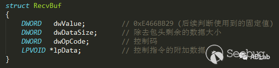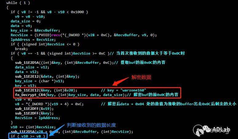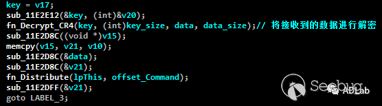 該木馬首先將接收到的前 0x0C 個字節作為頭部數據調用自定義fn_Decrypt_CR4函數進行解密(密鑰以明文方式硬編碼在代碼中)。成功解密后,取出偏移 0x04 處的 DWORD 數值作為是否繼續執行以下流程的判斷條件(此 DWORD 數值里保存著除去 0x0C 后,剩余的數據長度)。