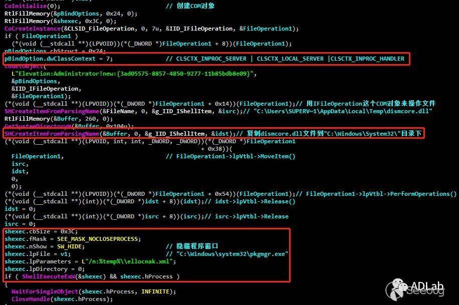 該木馬的權限提升是利用了自動提升權限的合法應用程序“pkgmgr.exe”來執行DISP模塊。其功能代碼實現是采用了 Bypass-UAC 框架,該框架可以通過調用 IFileOpertion COM 對象所提供的方法來實現自動提權。