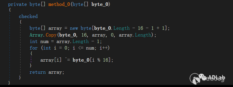 在經過逆序排列和 Base64 解碼后的字符串(byte_0)中,前16位為解密密鑰0x28 0x49 0xf7 0x30 0xec 0x8d 0x50 0x80 0x94 0xaf 0x85 0xaa 0xa8 0xe7 0xc0 0x41,之后為待解密密文。函數以16位為循環,將密鑰同密文依次進行按位異或,最終解密得到“DUMP1”文件并通過CallByName函數加載執行。