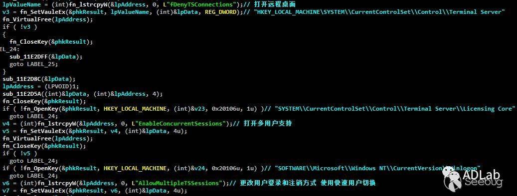 該木馬會修改注冊表信息,實現打開遠程桌面、多用戶支持、更改用戶登錄和注銷方式、使用快速登錄切換、以及設置遠程“終端服務”的使用名為“RDPClip”等等操作。具體細節如下圖所示(僅截取了部分步驟):