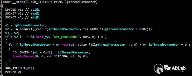 該木馬嘗試與遠程服務器進行通信,當連接成功時則會向服務器發送“AVE_MARIA”字串作為暗號。然后等待接收服務器返回數據,大小為4個字節。如果接收成功,則開啟新線程。