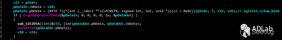 從該表中讀取的內容是加密的,通過CryptUnProtectData函數對其進行解密便可以獲取到明文數據。最后該木馬將解密后的數據保存在名為“xxx.tmp”(“xxx”為 Base64 解碼出的字串)的臨時文件中。