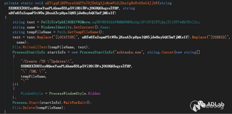 “DUMP1”文件同樣采用C#編寫,程序首先會睡眠50秒以躲避沙箱檢查,之后會檢測調試器并將自身釋放至%ApplicationData%\riNpmWOoxxCY.exe,接著創建“schtasks.exe”進程并添加計劃任務“Updates\riNpmWOoxxCY”,從而實現在登錄賬戶時自啟動,相關命令如下: