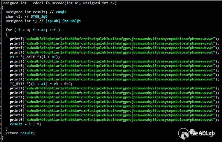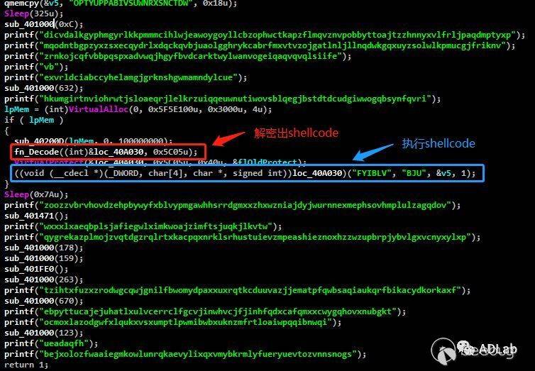此惡意程序在開始執行時,會通過大量的調用 printf 函數打印垃圾代碼和 sleep 函數來達到延時效果,這在一定程度上能夠躲避安全軟件的監控。而其核心功能是將自身攜帶的 shellcode 解密并執行: