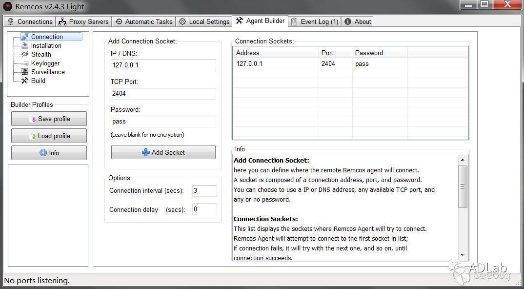 通過大量可疑信息我們確認此木馬為Remcos RAT的客戶端,且其使用的版本為2.3.0 Pro。以Remcos RAT免費版V2.4.3為例,服務端如圖所示: