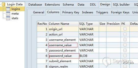Chrome 瀏覽器保存用戶登錄信息的數據庫文件為%AppData%\Local\Google\Chrome\UserData\Default\ Login Data,該數據庫是 sqlite3 的數據庫,數據庫中用于存儲用戶名密碼的表為 logins 。logins 表結構定義如下:
