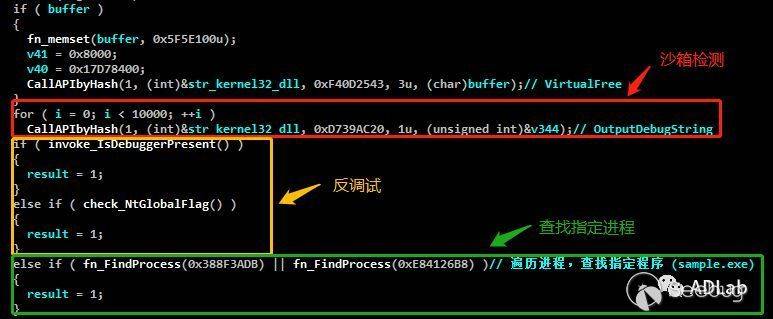 該 PE Loader 在開始運行時,依然會進行沙箱和調試環境的檢測,同時通過預先計算好的進程名哈希值來查找指定的進程。當這些檢測條件中的任意一條滿足時,該惡意程序就不再繼續執行,直接返回退出。