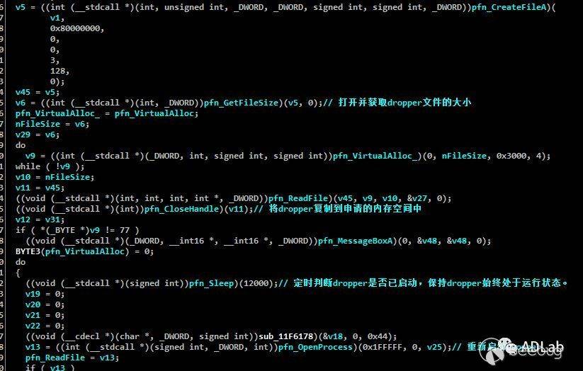 通過分析我們發現,這段注入代碼的主要功能是利用傀儡進程來保護Dropper(hqpi64.exe)。其會定時檢查 Dropper 是否處于運行狀態,如被關閉,則重新啟動。 以此達到進程守護的目的。