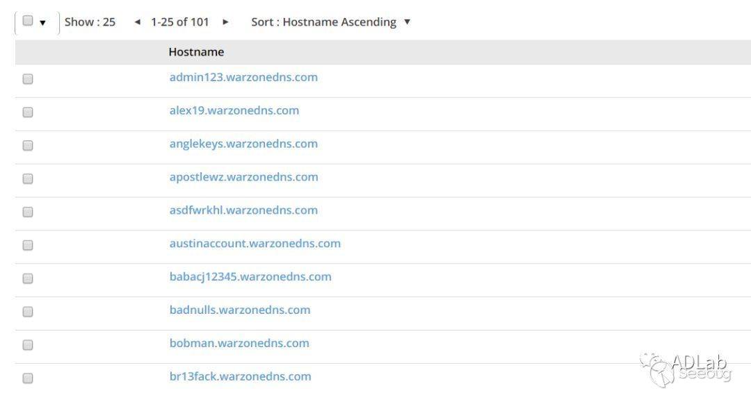 我們觀察到目前與 DDNS 服務 warzonedns.com 相關聯的子域名總數共101個,部分截圖如下: