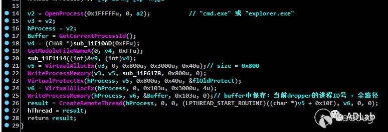 在后續的解密以及執行的過程中,此 Dropper 會把一段 Shellcode 注入到 explorer 進程并在內存中解密出RAT實體使其不落地,最終通過無文件技術將RAT加載到內存中來執行。