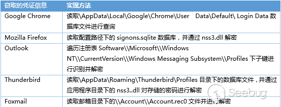 竊取的信息包括 Google Chrome、 Mozilla Firefox 等瀏覽器和 Outlook、Thunderbird、Foxmail 郵箱客戶端保存的憑證信息等。 該木馬獲取相關憑證信息以及實現方法如下表所示: