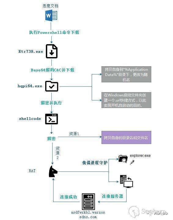 此次攻擊過程開始于一個攜帶惡意宏的DOC文檔,黑客通過偽造成簡歷的投遞郵件手段將此惡意文件發送給攻擊目標,當目標用戶不慎打開文檔便成為了受害者。DOC文檔運行后會啟動惡意宏代碼并從指定的服務器下載“Etr739.exe”,成功下載后立即執行。新進程通過 Base64 解碼出另一個服務器地址,繼續下載惡意代碼“hqpi64.exe”至臨時目錄下。惡意程序“hqpi64.exe”便是 Warzone RAT 的釋放器,其通過釋放 Warzone RAT 來執行后續操作,如將“explorer.exe”作為傀儡進程守護、與控制端進行通信等。