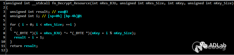 在準備好 RAT 的傀儡進程后,該 PE Loader 將結構體中的 szKey 值作為 key,和名為“BJU”的資源傳入解密函數。解密的算法僅為 XOR 運算,具體算法代碼如下圖: